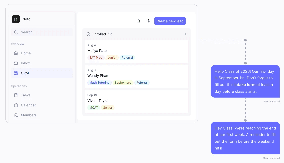 Most lesson businesses grow through relationships — but following up consistently is hard. Families forget to enroll after a trial. Old students drift away. Review requests get skipped during busy weeks.