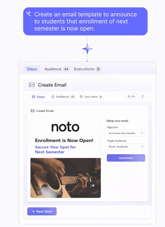 Noto’s built-in marketing automation helps you engage students and families, increase retention, and drive new enrollments — all using the data you already have. No separate tools. No manual lists. Just smart, automated outreach.